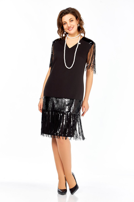 Нарядное платье полуприлегающего силуэта, с дизайнерской отделкой из ткани в паетки. Вырез горловины V-образной формы, отрезные кокетки из отделочной ткани, с бахрамой, имитирующей рукав. Подрез ниже линии бедер из отделочной ткани. Талиевые вытачки. Средний шов по спинке с потайной молнией и разрезом.