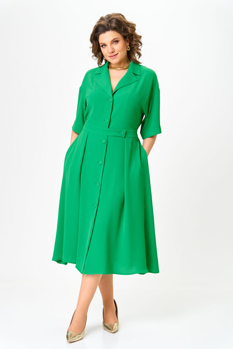 Платье женское со спущенным плечом, с центрально-бортовой застежкой на петли-пуговицы. Платье отрезное по талии, с имитацией пояса, фиксирующегося на петлю и пуговицу, по спинке с резинкой. Платье расширено к низу от линии талии. Горловина оформлена воротником пиджачного типа. Рукава до локтя с цельнокроеной манжетой.