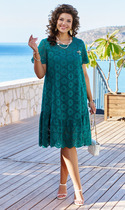 Платье женское полуприлегающего силуэта, отрезное выше талии. Нижняя часть со средним швом и разрезом. Спинка цельная, по отрезной линии талии собрана на резинку. Вся верхняя часть платья (перед, спинка и рукава) собраны на сборку протягивающимся шнуром, который завязывается сзади. По верхним частям переда и спинки разрезы. Рукав короткий, покроя «реглан».