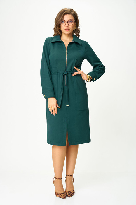Платье женское, полуприлегающего силуэта, втачного покроя рукава, выполнено из джинсовой ткани. По центру переда вставлена отделочная молния, внизу разрез. Перед отрезной по линии талии, в нижней части с накладными карманами, сверху с нагрудной вытачкой снизу вверх. Спинка так же отрезная по линии талии, нижняя часть со средним швом и талиевыми вытачками, верхняя часть со встречной складкой на уровне талии и кокеткой. На уровне талии настрачивается деталь, через которую на спинке протягивается пояс с пряжкой, по переду пояс завязывается по центру. Рукав длинный, двухшовный, внизу с манжетой, застегивающейся на петлю-пуговицу.