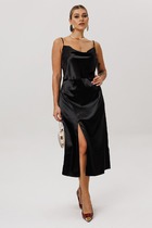 Платье женское полуприлегающего силуэта, втачного покроя рукава, выполнено из костюмной ткани с шифоновыми рукавами с металлизированной нитью. По переду отрезное по линии талии, верхняя часть, верхняя часть на подкладке, состоит из кокетки и лифа со складками, идущими на запах. Горловина «V - образной» формы. Спинка с талиевыми вытачками и средним швом, в котором разрез и застежка на тесьму-молнию. Рукав одношовный, длинный со сборкой по окату и собранный на резинку по низу. Дополнением служит пояс с пряжкой из основной ткани.