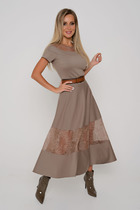 Женственное платье полуприлегающего силуэта из трикотажного полотна голубого цвета. Круглый вырез изделия обработан внутренней обтачкой. Втачные рукава выполнены из кружева. По переду изделия вставка из кружевного полотна. Аксессуары в комплект не входят.