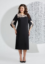 Яркое платье полуприлегающего силуэта из трикотажного полотна с купонным рисунком черного цвета. Круглый вырез изделия обработан внешней обтачкой и дополнен декоративным элементом. Платье с втачными рукавами.