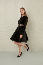 Женское платье из трикотажа с добавлением вискозы, предназначенное для повседневной носки. Модель выполнена в полуприлегающем силуэте и отрезаная по линии талии, что подчеркивает фигуру и создает элегантный образ. Лиф переда состоит из нескольких частей с имитацией корсета, придавая изделию стильный и структурированный вид. Лиф спинки выполнен с отрезной кокеткой и рельефами, обеспечивая хорошую посадку и аккуратность силуэта. Заднее полотнище юбки украшено двумя талиевыми вытачками для лучшей формы. В шве спинки расположена потайная застежка-молния и небольшой разрез в нижней части для удобства при движении. Горловина расширенная, что создает комфортный вырез. Рукава втачные длиной до локтя дополняют образ и обеспечивают комфорт. Длина платья — миди, цвет — черный, универсальный и легко сочетаемый с различными аксессуарами.