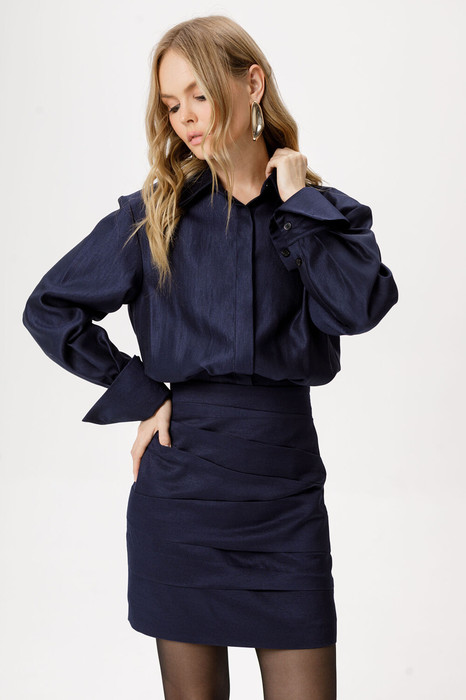 Детали: платье полуприлегающего силуэта, отрезное по талии с напуском, нижняя часть переда с ассиметричными складками, нижняя часть спинки с талиевыми вытачками, верхняя часть платья со складками на талии, рубашечный воротник, застёжка на потайную планку с пуговицами, потайная молния в боковом шве, рубашечный покрой рукава с расширенным плечом, широкие манжеты. Юбка платья на подкладке.