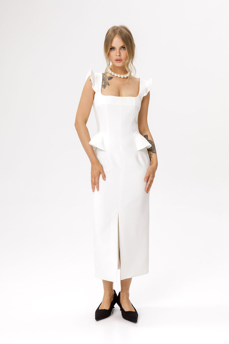 Приталенное миди-платье с глубоким вырезом и отлетными деталями по талии.