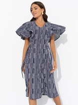 V-образный вырез горловины обработан планкой. Средний шов спинки снизу заканчивается разрезом. Талия подчёркнута съёмным завязывающимся поясом. Платье декорировано брошью.