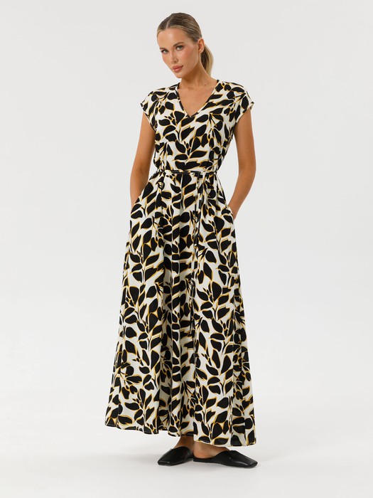 Модель А-образного силуэта, со спущенным плечом и V-образным вырезом горловины. Горловина и пройма окантованы. В боковых швах карманы. Талия подчёркнута завязывающимся поясом-шнурком.