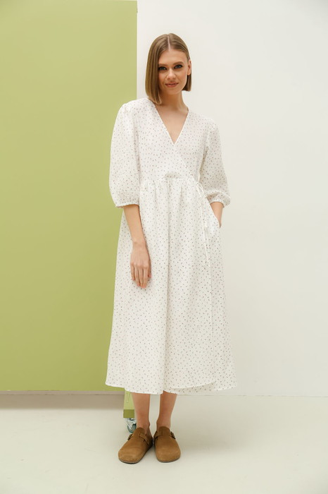 Романтичное платье свободного силуэта на запах длиной миди. Платье отрезное по линии талии и сборкой по юбке. Рукав вточной одношовный 3/4 на резинке снизу. Длина изделия - 119 см. Длина рукава - 40 см.