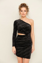 Платье прилегающего силуэта, с боковым вырезом. Ткань с металлической обработкой в виде пайеток.