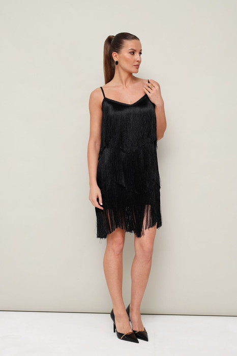 Нарядное платье, декорированное отделочное бахромой.