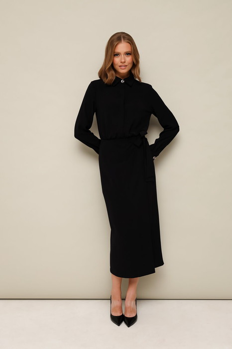 Платье отрезное по линии талии, полуприлегающего кроя, выполнено из плательной струящейся ткани. Горловина с рубашечным воротником на притачной стойке. Лиф с центральной застежкой на потайную планку на петли и пуговицы. По талии обработана резинка для регуляции размера. Юбка с имитацией запаха с застежкой на притачной пояс из основной ткани, который фиксируется на бант. Рукава длинные с притачной манжетой с застежкой на пуговицы.