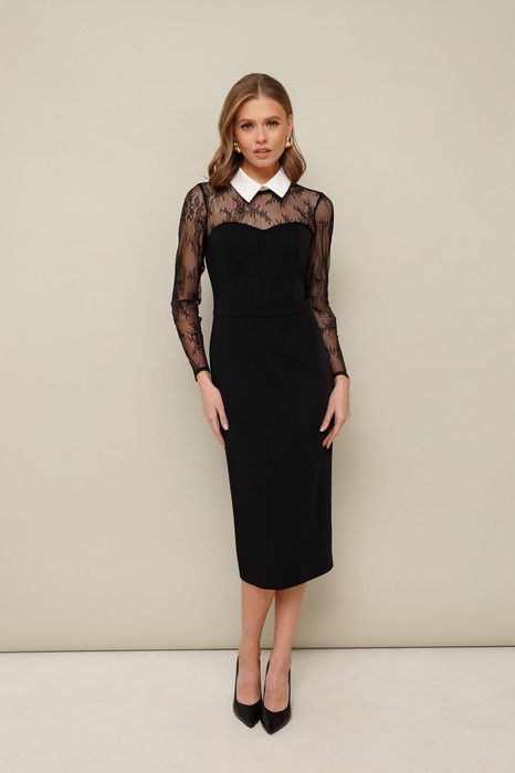 Платье-футляр прилегающего силуэта, отрезное по линии талии, в длине миди. Горловина округлая, вырез лифа фигурной формы с рельефами. Лиф и юбка выполнены из плательно-костюмной ткани. Рукава, кокетка лифа и спинки выполнены из кружевного полотна. Рукава длинные втачные. Акцентом платья является съемный воротничок, который застегивается на потайные пуговицы и навесные петли. Застежка на потайную тесьму-молнию в среднем шве спинки. Для удобства движения в нижней части юбки обработан разрез.
