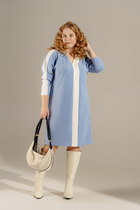 Платье свободного кроя, длиной до середины бедра. На левом переде настрочен накладной карман. Воротник пиджачного типа. Застежка по переду потайная на петли и пуговицы. Рукава одношовные, втачные, длинные. По низу рукава обработан разрез, односторонние складки и притачная манжета, которая застегивается на навесные петли и пуговицы. Платье дополняет съемный пояс с пряжкой.