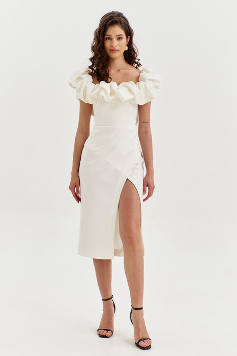 Платье прилегающего силуэта, длиной до середины икры. Платье отрезное по линии талии. Лиф платья выполнен в виде корсета со шнуровкой по спинке. Юбка спинки с талиевыми вытачками и средним швом, в котором обработана застежка на потайную тесьму-«молнию». Юбка переда выполнена на запах с ассиметричным разрезом. Платье с объемным декором в области груди, рук и спинки.
