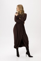 Платье женское относится к нарядной торжественной одежде. Платье полуприлегающего силуэта, с отлетной накидкой длиной за колено. Перед с двумя нагрудными вытачками, с двумя талиевыми вытачками. Спинка с двумя талиевыми вытачками и средним швом, заканчивающимся шлицей. Застежка на потайную тесьму-молнию в среднем шве спинки. Горловина круглая, обтачная, без воротника, по горловине закреплена накидка. Слева на уровне линии талии отделочным хлястиком, декорированным тесьмой накидка закрепляется на платье, нижняя часть накидки закреплена в левом боковом шве. Накидка с фигурным низом. Платье без рукавов. Длина спинки 103 см. Длина накидки от горловины 38 см