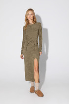 Платье женское выполнено в виде имитации жакета и юбки. Платье отрезное по линии талии. Верхняя часть платья выполнена в виде жакета, с асимметричным передом с запахом. Верхняя часть переда (жакета) с двумя отрезными бочками, на правой части переда обработан отрезной карман с клапаном и 2-мя обточками. Нижняя часть переда (юбка) цельнокроеная. Верхняя часть спинки (жакета) со средним швом и 2-мя отрезными бочками. Нижняя часть (юбки)-цельнокроеная. Горловина с V-образным вырезом, с втачным воротником пиджачного типа с отрезным лацканом. Застёжка на 2-е обмётанные петли на поясе и 2-е пришивные пуговицы на бочке спинки. Рукав втачной 2-х шовный. Верхняя часть платья и нижняя на подкладке. Платье с плечевыми накладками. Длина платья 132 см