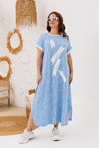 Платье женское предназначено для повседневной носки. Платье женское расширенное к низу, длиной до середины икры. Платье отрезное по линии талии. Верхняя часть переда с 2-мя нагрудными вытачками. Верхняя часть спинки цельнокроеная. Нижняя часть платья с лёгкой сборкой по верхнему срезу, с притачным воланом с лёгкой сборкой по верхнему срезу. Платье с карманами в боковых швах. Горловина с V-образным вырезом, обточная без воротника. Рукав втачной, двухшовный, длиной до локтя, с кулисой на верхнем шве. Платье с плечевыми накладками. Длина спинки 113 см, длина рукава 34 см.