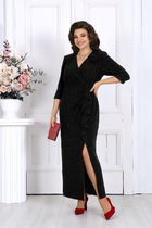Платье женское, предназначено для повседневной носки. Платье женское А-силуэта, длиной за колено. Перед с 2-мя нагрудными вытачками, с надстрочной вертикальной планкой, декорированной 3-мя пришивными пуговицами, с отрезной притачной планкой по горловине, шов притачивания декорирован отделочной тесьмой с бусинами. Спинка с 2-мя таллиевыми вытачками и средним швом. Платье с карманами в боковых швах. Горловина круглая, обточная, без воротника. Застёжка на потайную тесьму-молнию в среднем шве спинки. Рукав втачной, 2х шовный, длиной 3/4. Платье на подкладке. Платье с плечевыми накладками. Длина спинки платья 98 см. Длина рукава 48 см.
