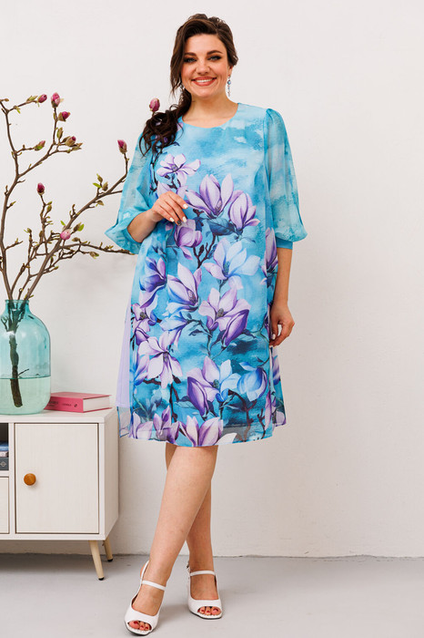 Платье женское, относится к коктейльным платьям. Платье женское, А-силуэта, длиной за колено. Перед с 2-мя нагрудными вытачками, выходящими из проймы. Спинка вверху по горловине с обтачным разрезом, фиксирующимся на 1-ну навесную петлю и 1-ну пришивную пуговицу. Горловина круглая, обтачная, без воротника. Боковые швы с очень высокими разрезами. Рукав втачной, двух шовный, длиной 7/8, с притачной манжетой из отделочной ткани, частично собранной на эластичную тесьму; верхний шов с высоким разрезом. По окату рукава и низу рукава лёгкая сборка. Платье на подкладке из текстильной отделочной ткани. Платье без плечевых накладок. Длина спинки платья 100 см, Длина рукава 50 см.