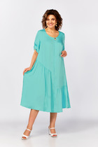 Платье предназначено для повседневной носки. Платье женское отрезное по линии талии, расширенное к низу, длиной до середины икры. Верхняя часть переда с 2-мя нагрудными вытачками, с притачной потайной вертикальной планкой. Верхняя часть спинки цельнокроеная. Горловина с V-образынм вырезом обтачная без воротника. Застёжка цельнокроеная бортовая на 11-ть навесных петель и 11-ть пришивных пуговиц. Нижняя часть переда с 2-мя односторонними складками и 1-ной встречной по центру. Нижняя часть спинки так же с 2-мя односторонними складками и 1-ной встречной по центру. Шов соединения верхней и нижней частей платья собраны на эластичную тесьму. Рукав втачной, одно шовный длиной за локоть. Окат рукава с лёгкой сборкой, низ рукава собран на эластичную тесьму. Платье на подкладке. Платье без плечевых накладок. К платью прилагается съёмный пояс. Длина спинки платья 116 см, длина рукава 37 см.