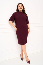 Платье женское, относится к нарядной торжественной одежде. Платье женское, полу прилегающего силуэта, длиной за колено. Перед с 2-мя отрезными кокетками, с 2-мя нагрудными вытачками. Спинка с 2-мя таллиевыми вытачками. Горловина фигурная, обточная, без воротника, по переду квадрат, по спинке V-образный вырез, горловина декорирована втачным кружевом, по спинке отделочный бант с пришивным украшением. Рукав втачной одно шовный, короткий. Платье на подкладке. Платье с плечевыми накладками. Длина спинки платья 105 см, длина рукава 31 см.