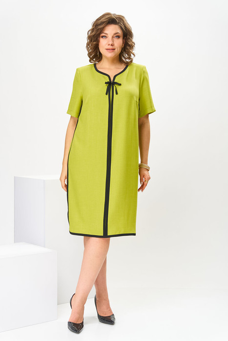Платье женское предназначено для повседневной носки. Платье женское, полу прилегающего силуэта, длиной за колено. Перед с2-мя нагрудными вытачками и средним швом. Спинка с 2-мя таллиевыми вытачками средним швом. Платье с отрезными бочками. Горловина фигурная. Срезы горловины переда, среднего шва переда, низа платья, боковые швы переда и спинки обработаны косой бейкой из отделочной ткани, ширина бейки 1,2 см. Вырез горловины декорирован пришивным бантом из отделочной ткани и пришивной стразой. Низ платья фигурный. Рукав втачной, одно шовный, длиной 7/8. Платье с плечевыми накладками.