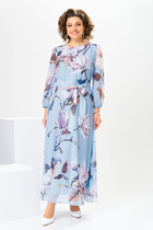 Платье женское относится к нарядной торжественной одежде. Платье женское отрезное по линии талии, расширенное к низу, длинное. Верхняя часть переда с 2-мя нагрудными вытачками, нижняя часть цельнокроеная. Верхняя часть спинки с 2-мя таллиевыми вытачками, с обработанным разрезом по головине, фиксирующимся на 1-ну навесную петлю и 1-ну пришивную пуговицу; нижняя часть спинки цельнокроеная. Горловина круглая, обточная, без воротника. Рукав втачной одно шовный, длинный. Рукав со сборкой по окату. Низ рукава собран на эластичную тесьму. Платье на подкладке. Платье без плечевых накладок. К платью прилагается съёмный пояс. Длина спинки платья 137 см, длина рукава 55 см.