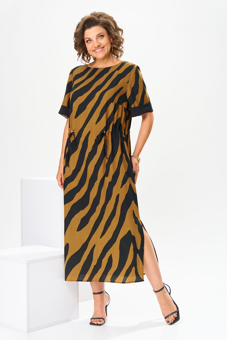 Платье женское, предназначено для повседневной носки. Платье женское, прямого силуэта, длиной до нижней части икры. Перед с 2-мя нагрудными вытачками. Спинка с V-образным, обтачным вырезом, зафиксированным патой из отделочной ткани и пришивной пуговицей. Горловина круглая, обточная, без воротника. На уровне линии талии обработана кулиса со шнуром, регулирующим ширину по линии талии 2-мя фиксаторами. Боковые швы с разрезами. Рукав втачной, короткий, одно шовный, с притачной отложной манжетой из отделочной ткани. Платье с плечевыми накладками. Длина спинки платья 125 см, длина рукава 28 см.