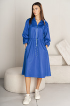 Платье женское, коктейльное. Платье женское прямого силуэта, длиной до нижней части икры. Перед с 2-мя нагрудными вытачками. Спинка цельнокроеная. Горловина круглая, обточная, без воротника. Боковые швы с карманами; внизу с разрезами. Рукав втачной короткий одно шовный с притачной отложной манжетой. Платье с плечевыми накладками. К платью прилагается съёмный пояс. Длина спинки платья 130 см. Длина рукава 29 см.