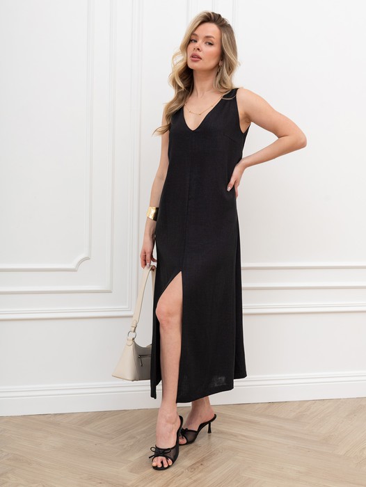 Платье женское из гладкокрашеного тканого полотна, свободное, слегка расширенное к низу, с глубоким V-образным вырезом горловины, обработанным внутренней обтачкой, без рукавов, с вытачками в области груди. Перед состоит из двух частей, в шве соединения деталей по центру длинный разрез.
