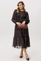 Платье женское полуприлегающего силуэта, слегка зауженное к низу с втачным рукавом. Горловина округлой формы с застежкой капелькой по переду. По линии груди переда вытачки. Спинка со средним швом и разрезом по низу. Рукав объемной формы состоит из двух деталей и декорирован тесьмой из пайеток. В верхней части рукава сборка. Нижний срез рукава присборен и обработан притачной манжетой с застежкой на петлю и пуговицу.