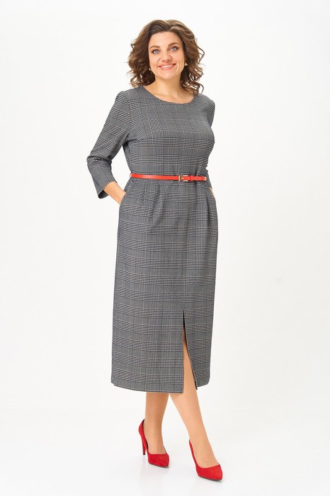 Платье женское полуприлегающего силуэта  с втачным рукавом. Перед платья с горизонтальным эластичным швом по талии. Верхняя часть с вытачками по линии груди, нижняя часть  со складками  в области талии и карманами что обеспечивает прекрасную посадку и подчеркивает фигуру. Рукав длиной 7/8.  Высокие разрезы по бокам и переду платья добавляют удобства. В комплекте съемный ремень.