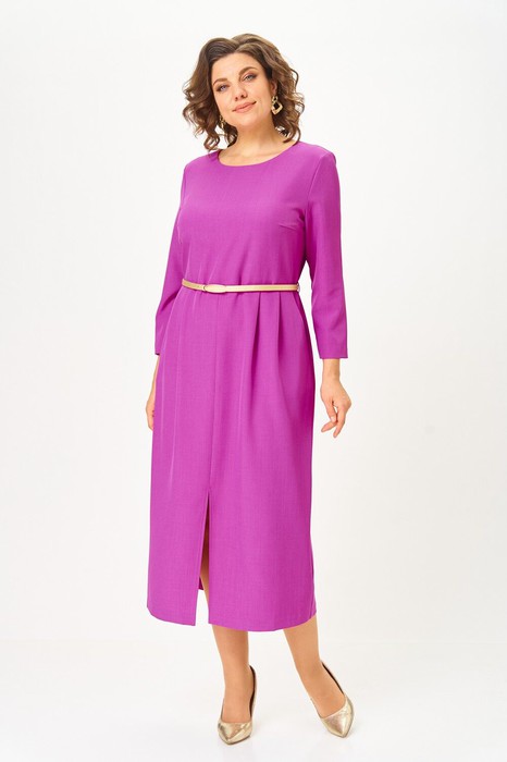 Платье женское полуприлегающего силуэта  с втачным рукавом. Перед  платья с горизонтальным швом по талии. Верхняя часть с вытачками по линии груди, нижняя часть  со складками  в области талии и карманами что обеспечивает прекрасную посадку и подчеркивает фигуру.  Разрез по переду платья добавляет нотку игривости и удобства. В комплекте съемный ремень.