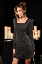 Платье женское свободного силуэта из трикотажного полотна. Модель длины - миди с изящной драпировкой по переду, с втачным рукавом длиной7/8. Горловина округлая. Верхняя часть переда украшена декоративной планкой с пайетками. Спинка цельная. В боковых швах обработаны карманы.