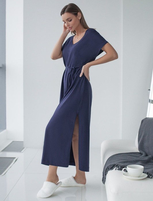 Состав: 100%Хлопок Плотность: 140 Г/м2Длинное платье темно-синего цвета с V-вырезом из премиального 100% хлопка плотностью 140 Г/м2 сочетает в себе легкость и благородный стиль. Главная особенность этого изделия — тонкое кулирное полотно, которое легче и воздушнее стандартного трикотажа. Благодаря своей деликатной текстуре модель идеально подходит для домашних образов и пижамных комплектов. Ткань отлично «дышит», обеспечивая максимальный уют во время сна и отдыха. Женственный образ подчеркивает красивое декольте и тонкий пояс, который позволяет регулировать посадку по талии и создает А- силуэт. Модель украшена элегантным высоким разрезом сбоку, добавляющим свободы движению и нежности силуэту. Дышащий материал отлично подходит для теплой весны и лета, не теряет вида после длительного ношения, обеспечивая комфорт даже в жаркую погоду. Короткий цельнкроеный рукав добавляет свежести и удобства, делая платье универсальным для разных сезонов и случаев. Представленная широкая размерная линейка позволяет выбрать подходящий вариант для любой фигуры, в том числе и на большие размеры. Платье А-силуэта и длины макси подойдет девушкам и женщинам на низкий рост, а так же на высокий рост. Стильное платье гармонично сочетается с разными аксессуарами, помогая создавать как повседневные, так и более нарядные образы. Отсутствие сложных деталей делает это повседневное платье удобным для тех, кто ценит простоту и стиль одновременно. Будьте шикарной женщиной в этом красивом платье даже дома.