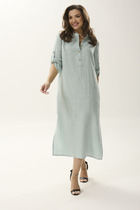 Платье из мягкой вискозно-льняной ткани полуприлегающего силуэта. По переду обработаны нагрудные вытачки и планка до линии груди, застёгивающаяся на 4 петли и 4 декоративные металлические пуговицы. По переду платья расположены два нагрудных клапана с пуговицами. Воротник рубашечный с отрезной стойкой. Рукав цельнокроеный, короткий, спущенный с отложной манжетой по низу. В комплекте пояс из основной ткани.