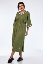 Платье из эластичного трикотажного полотна полуприлегающего силуэта. По переду обработаны нагрудные вытачки. Спинка цельнокроеная. Рукав втачной одношовный длиной 4/5 с манжетой из декоративного трикотажного довяза. В боковых швах обработаны карманы. Горловина V-оборазной формы, обработана декоративным трикотажным довязом.