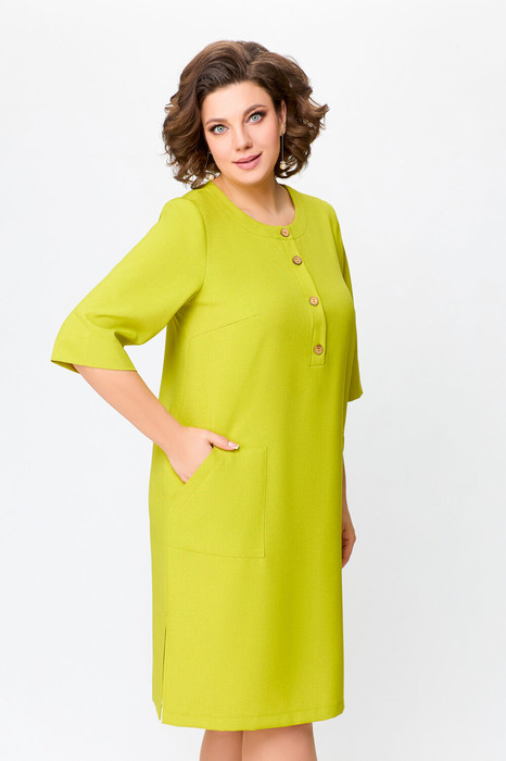 Платье прямого силуэта из  вискозно-льняной ткани, полочка с планкой , застегивающейся на петли и декоративные пуговицы, с нагрудными выточками и накладными фигурными  карманами в области бёдер, горловина круглая, обработана притачной  обтачкой, рукав втачной, одношовный, длиной ниже локтя. В боковых швах разрезы длиной 20 см.