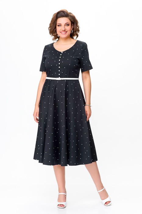 Платье из хлопка Х-образного силуэта с полуприлегающим лифом. Платье отрезное по линии талии. Перед лифа с рельефами, выходящими из плечевого шва. В центральном шве лифа ряд навесных петель с декоративными пуговицами, спинка лифа с талиевыми выточками. Горловина V-образной формы, рукав втачной, короткий. Застёжка в боковом шве на потайную тесьму-молнию.