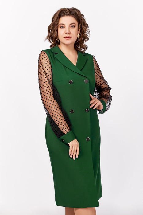 Нарядное платье из поливискозной ткани, полуприлегающего силуэта. Спереди имитация двубортной застёжки с декоративными пуговицами в два ряда. Полочки с фигурными бочками и нагрудными выточками. Спинка с центральным швом и талиевыми выточками. Горловина V-образной формы с отложными лацканами и воротником пиджачного типа. Рукав втачной длинный из отделочной ткани «сетка», по низу со сборкой и манжетой из основной ткани, застёгивающейся на петлю и декоративную пуговицу. В боковом шве застёжка на потайную тесьму-молнию.