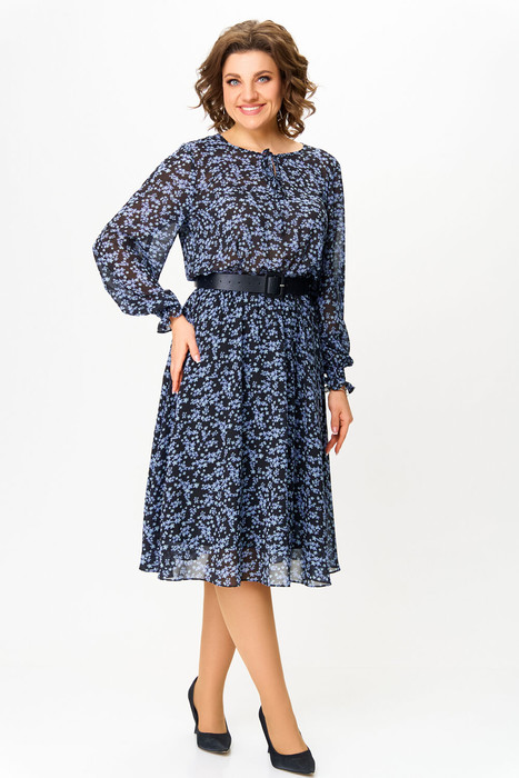 Платье длиной миди, выполнено из шифона на трикотажной подкладке. Лиф отрезной по линии талии. Талия регулируется эластичной тесьмой (резинкой). Нижняя часть платья А-силуэта. Подкладка верхней части платья на бретелях. Рукав втачной длинный, в нижней части собран на эластичные строчки, которые внизу образуют рюшу . Горловина округлой формы, по центру переда капелька с завязкой.
