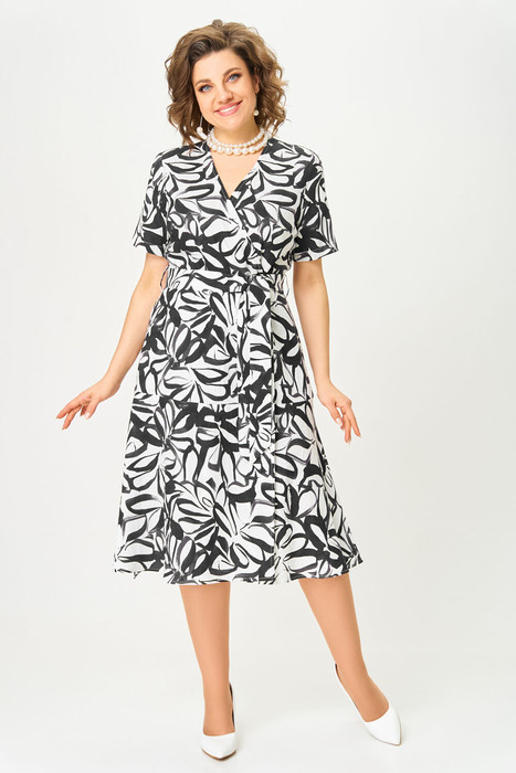 Платье из вискозной ткани на запах с отрезной линией талии. Лиф полуприлегающего силуэта. Полочки лифа с нагрудными вытачками, спинка лифа с талиевыми вытачками. Горловина V-образной формы, рукав втачной короткий. Юбка платья А-силуэта, с карманами в боковых швах и притачным широким воланом по низу. Застёжка на две пуговицы по шву талии. В комплекте пояс из основной ткани.