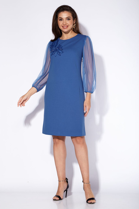 Платье женское, полуприлегающего силуэта с рукавом длиной 7/8. Рукав выполнен из отделочной ткани (сетка), фантазийной формы. По верху рукава сборка. Низ так же присобран на узкую резинку. По переду нагрудные и талевые вытачки. Перед платья, сверху задекорирован вышивкой. Вырез горловины круглой формы. По спинке средний шов и талевые вытачки. Застежка в шве на потайную "молнию". По низу разрез. Длина платья по спинке 48-50 93 см, 52-56 96 см.