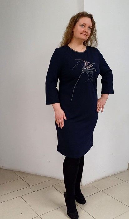 Платье женское А-образного силуэта с втачным рукавом, длиной 3/4. По переду рукава шов, с разрезом по низу, оформлен потайной тесьмой "молния" Вырез горловины круглой формы с отделочной бейкой. Перед платья задекорирован вышивкой.По спинке средний шов и талевые вытачки. Застежка на потайную тесьму "молния" в среднем шве.