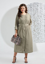 Платье женское, свободного силуэта. Рукав со спущенной линией плеча длинной 3/4 с разрезом по локтевому шву. По переду центральный шов с застежкой на планку с кнопками до линии талии. Вырез горловины круглой формы. Левая полочка задекорирована всавкой с принтом и отделочным клапаном. Карманы в боковых швах. По спинке кокетка и встречная складка. По низу небольшие разрезы по бокам. Сзади низ чуть удлиненный. Талию подчеркивает съемный пояс.