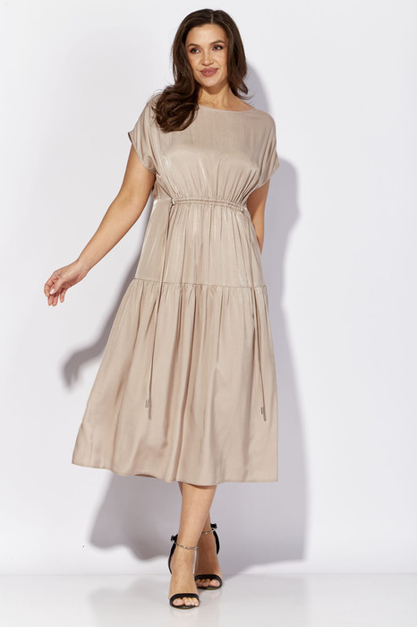 Платье женское, свободного силуэта, расширенное к низу. Рукав короткий, цельнокройный. Горловина круглой формы.По спинке небольшой разрез в средном шве, акцентирован декором "монетка" Разрез выше линии тали, по переду регулируется с фиксаторами. По центру спинки небольшая сборка. Подрез по линии бедер оформлен присобранным воланом.