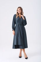 Платье женское, свободного силуэта, расширенное к низу. Рукав короткий, цельнокройный. Горловина круглой формы.По спинке небольшой разрез в средном шве, акцентирован декором "монетка" Разрез выше линии тали, по переду регулируется с фиксаторами. По центру спинки небольшая сборка. Подрез по линии бедер оформлен присобранным воланом.