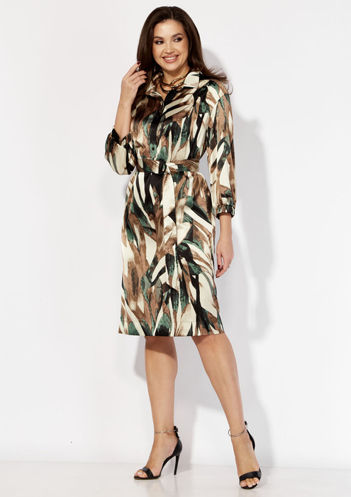 Платье женское, прямого силуэта с рукавом длинной 7/8. Рукав со спущенной линией плеча, по низу манжета с резинкой. Воротник рубашечный, на стойке. Застежка до линии талии, с отрезной планкой на петли и пуговицы. Из под кокеток переда и спинки-сборка. По боку платья, шлица. Линию талии подчеркивает съемный пояс с полукольцами.