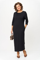 Платье женское, прямого силуэта, с цельнокройным рукавом, длинной 7/8.По переду ассиметричный, фигурный подрез , оформлен воланом и отделочной тесьмой. По спинке средний шов. Вырез горловины круглой формы с тонкой, подрезной бейкой.